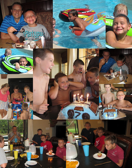 He has a lot of friends, 1/2 in 2nd grade and 1/2 in 3rd grade. And he's bigger than all of them, except his brother, Andrew. He loves to play Heroscape with Eli, Nathaniel, and Andrew. He loves to play basketball, soccer, and baseball. He doesn't love to empty the dish washer, but he loves taking out the trash (he says it's easy). He loves to draw all the time and when he gets a chance he likes to watch "Phenius and Ferb". He may have a favorite food, but I don't know what it is, he likes everything except maybe lasagna and curry, but he eats them any way. He requested and got Papa John's Pizza for his birthday dinner and a huge birthday breakfast with sausage, bacon, biscuits, waffles, blueberry compote, strawberry compote, and plain scrambled eggs...and best of all he is considerate enough to know it is difficult to make all of that on a week day, so he wanted it delayed until the Saturday after his actual birthday, so we "can enjoy it slowly and all together". So, I made blueberry muffins for him on his actual day...which I loved, but they are not his favorite, and that huge spread for him on the Saturday after his birthday. We are so glad Ry's a special part of our family! We wouldn't be the same without him! Happy Birthday, little guy!